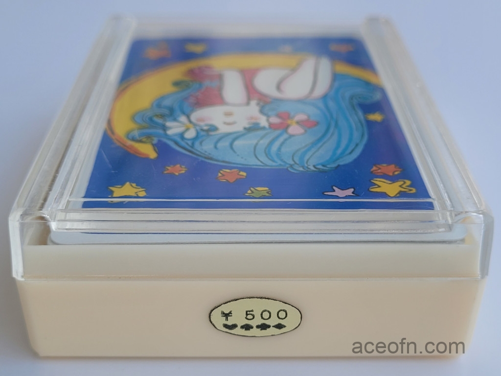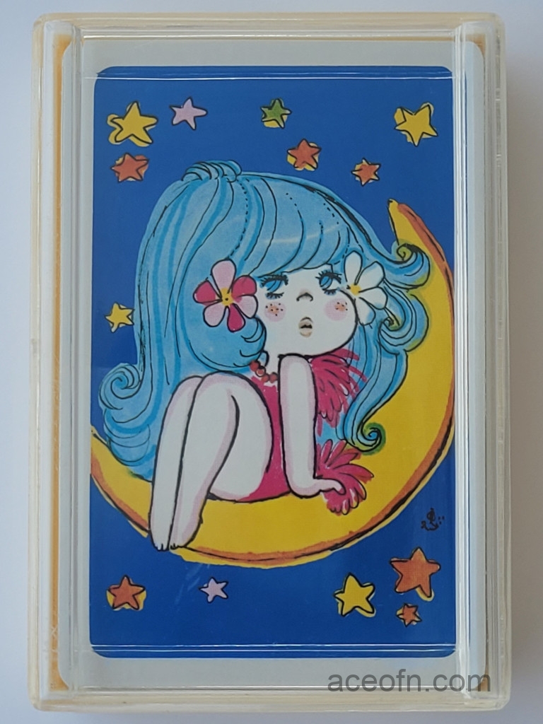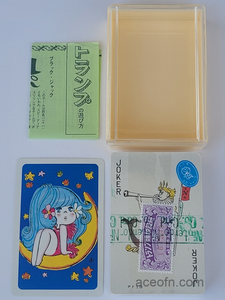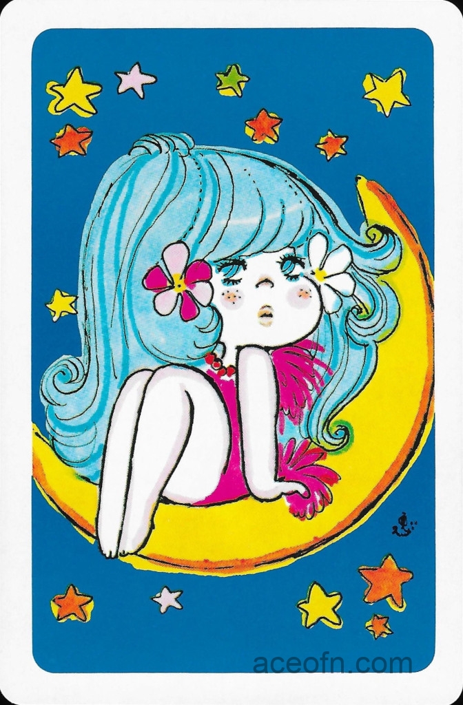 Ado 19 Posted in Standard decks No Comments Last updated on August 30, 2025 Tagged with ado mizumori, blue, flower, girl, moon, star Ado series No. 19 (originally sold for 500¥).Deck illustrated by Ado Mizumori (亜土水森) the joker has アド (“Ado”) written in the bottom left corner
