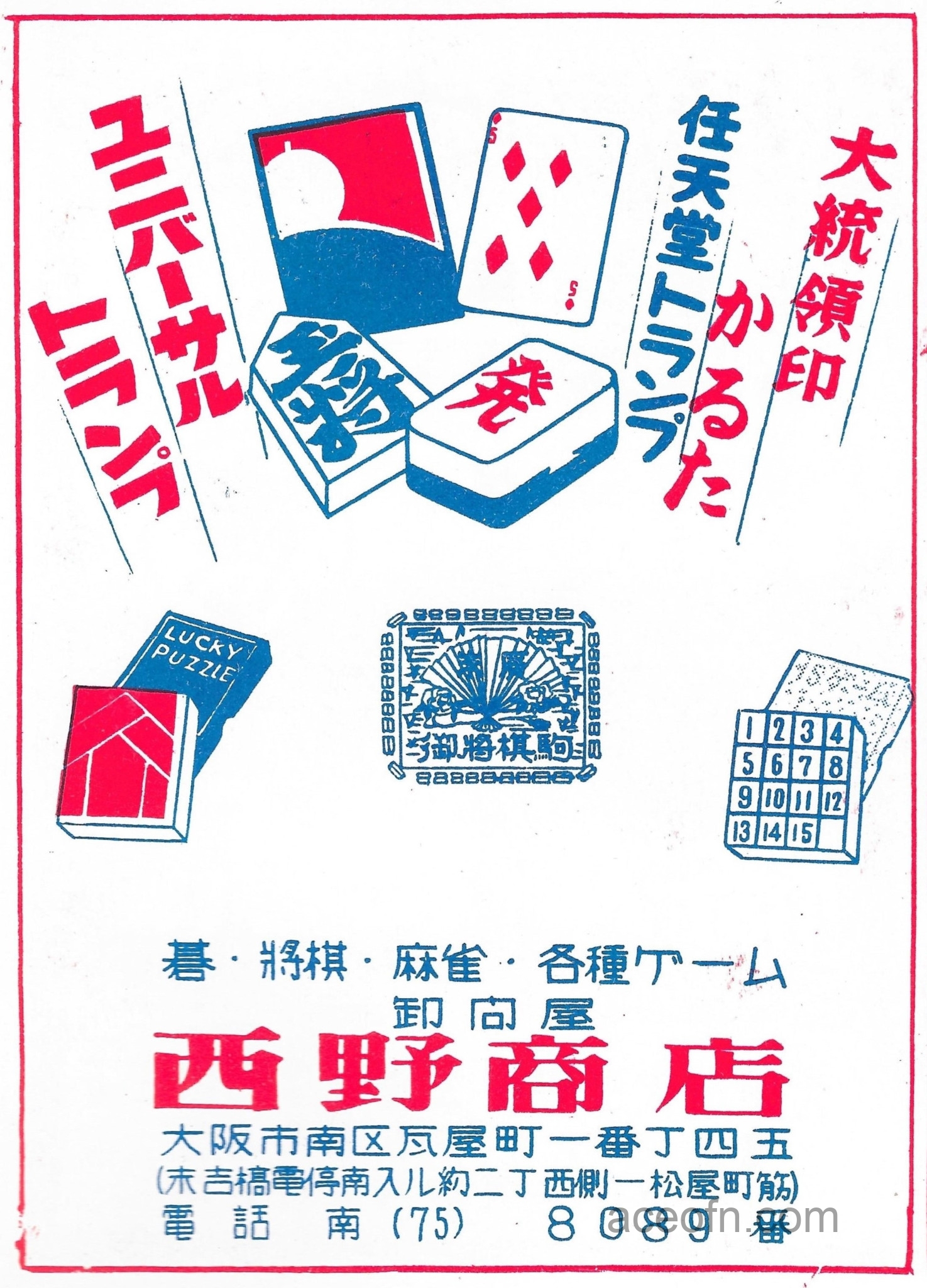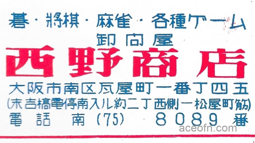 This is a shop called 西野商店 located in Osaka, in the Minami district, and it sells games such as Go, Shogi, Mahjong and various other games.