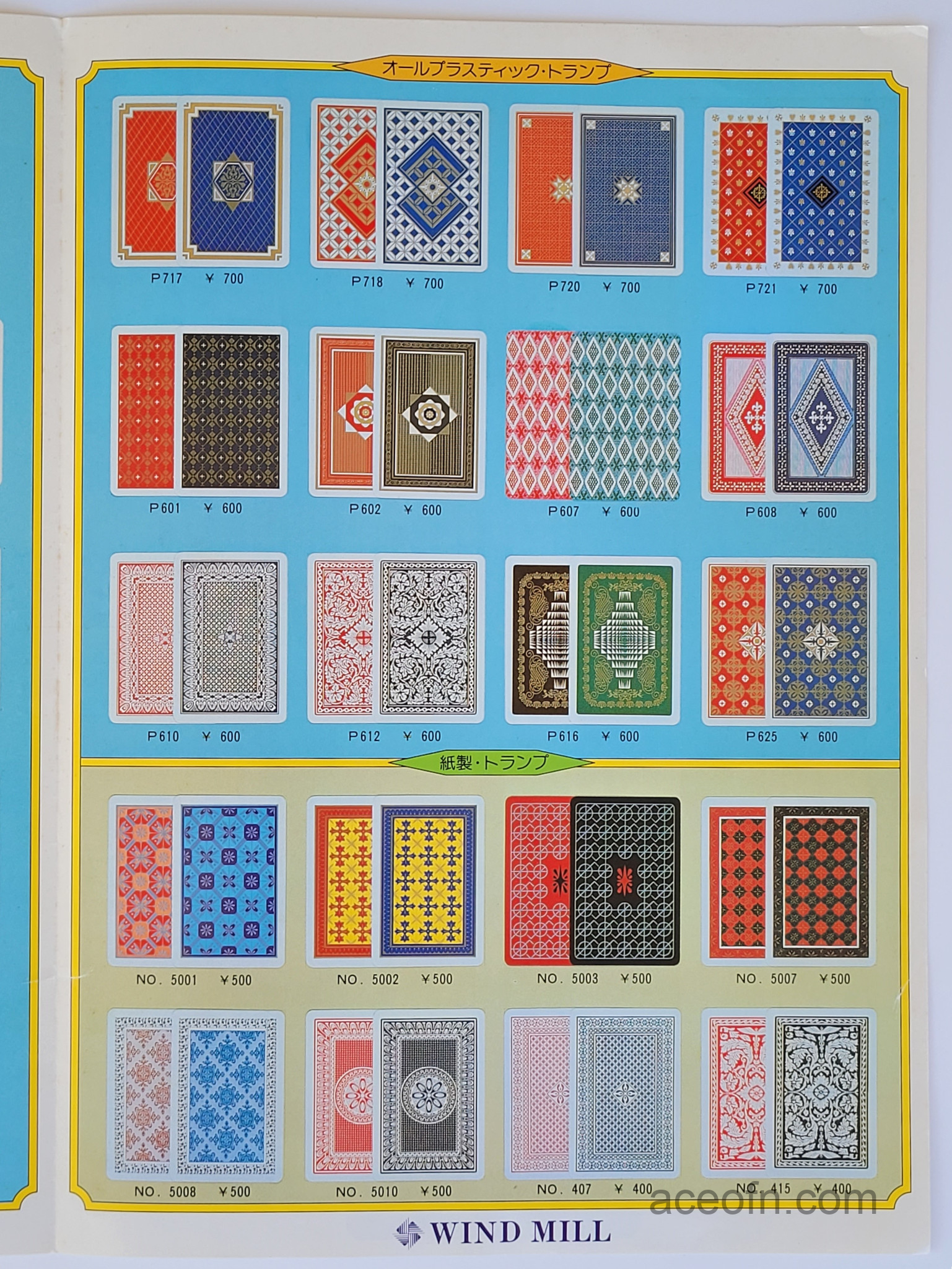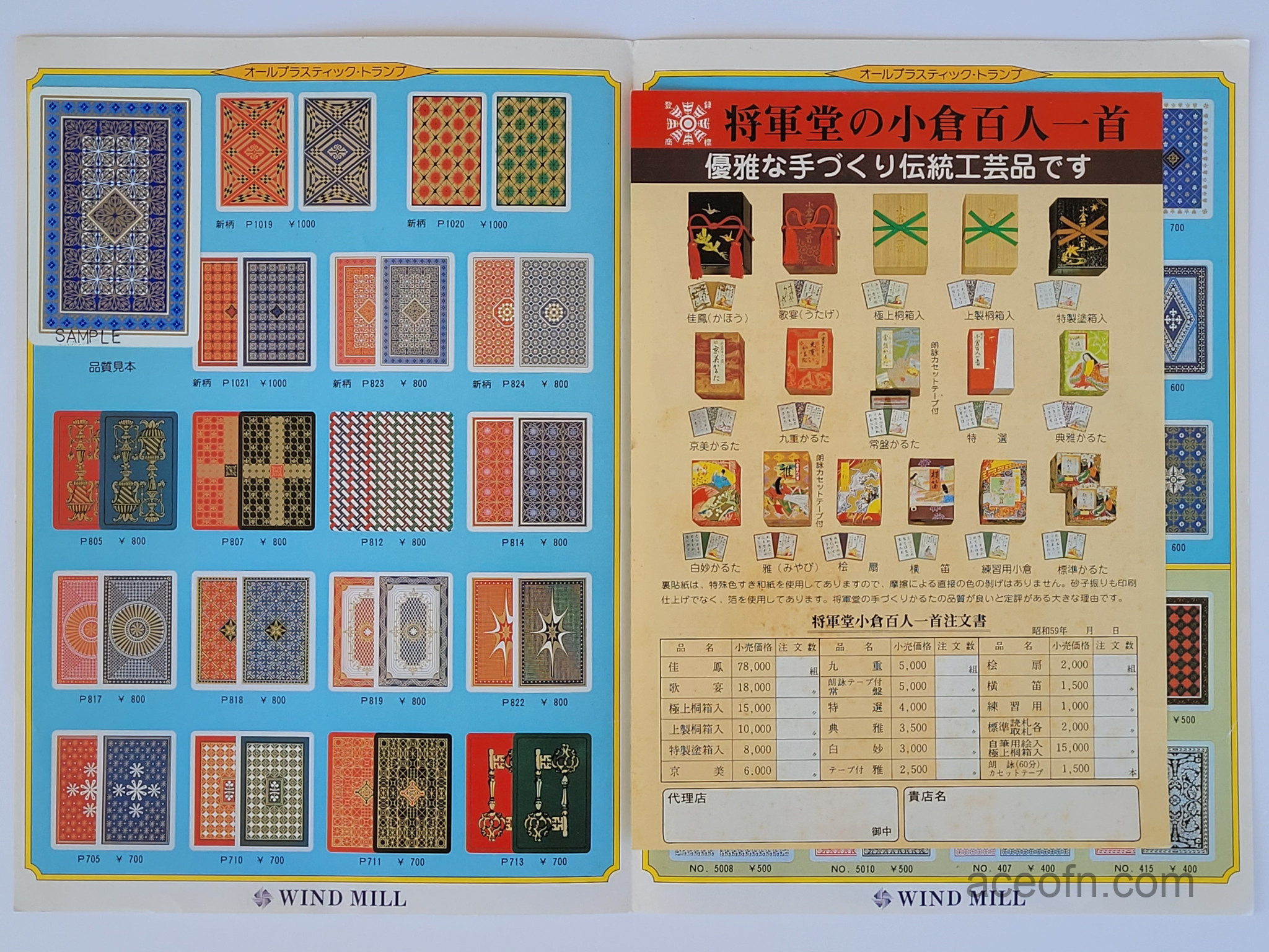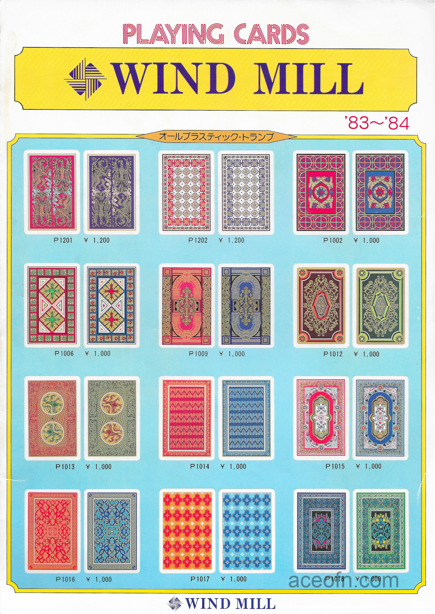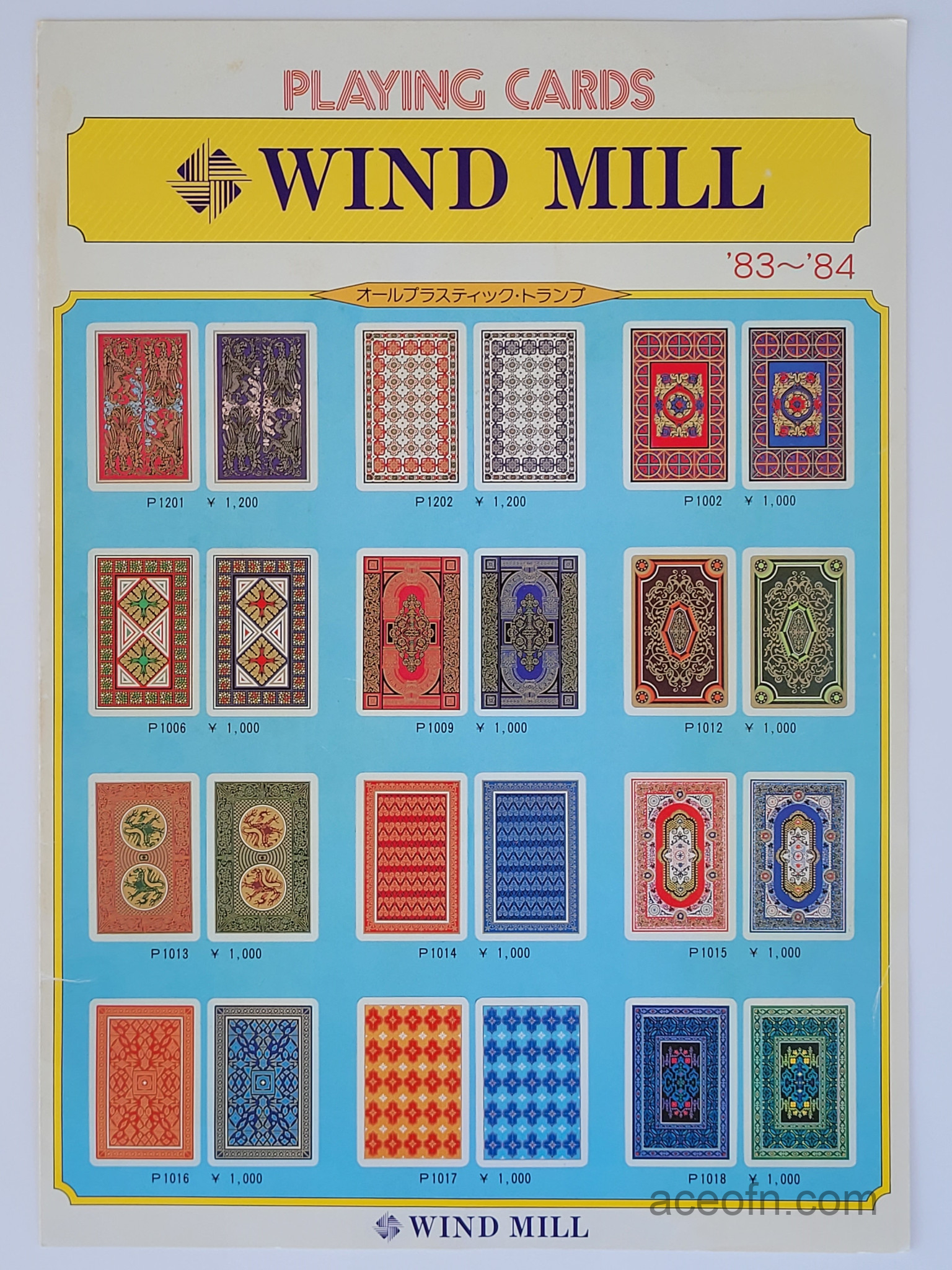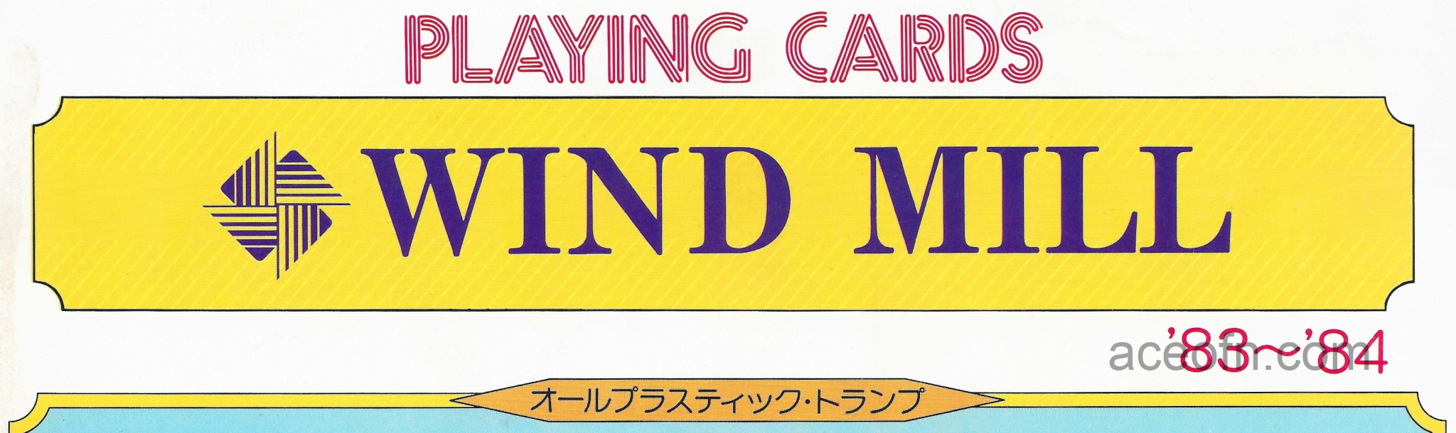Wind Mill catalogue – 1983-1984 Posted in Merchandise No Comments Last updated on November 17, 2025 Wind Mill playing cards catalogue from 1983-1984.It consists of 4 pages, plus a flying leaflet of hanafuda and Ogura Hyakunin Isshu cards.