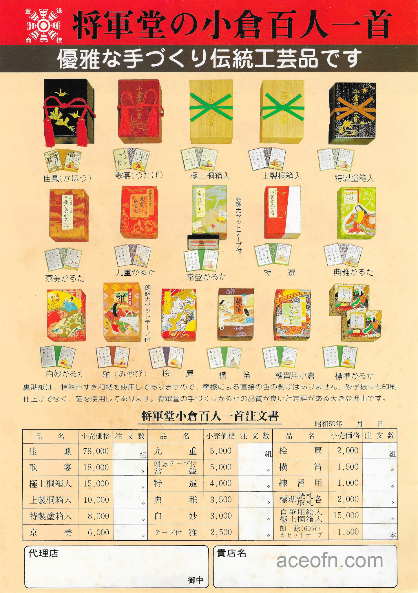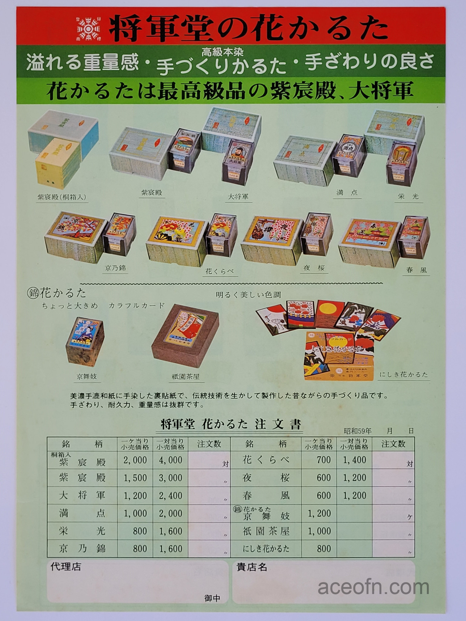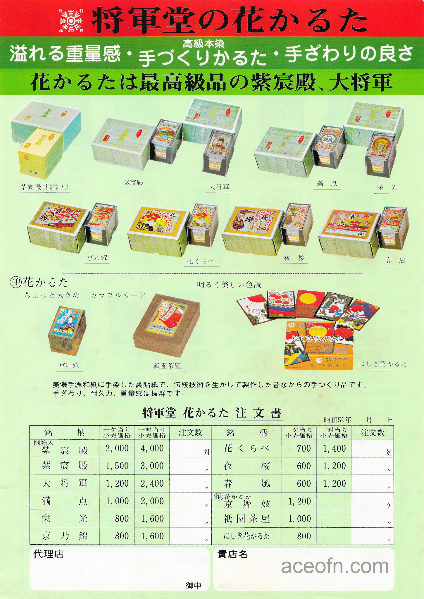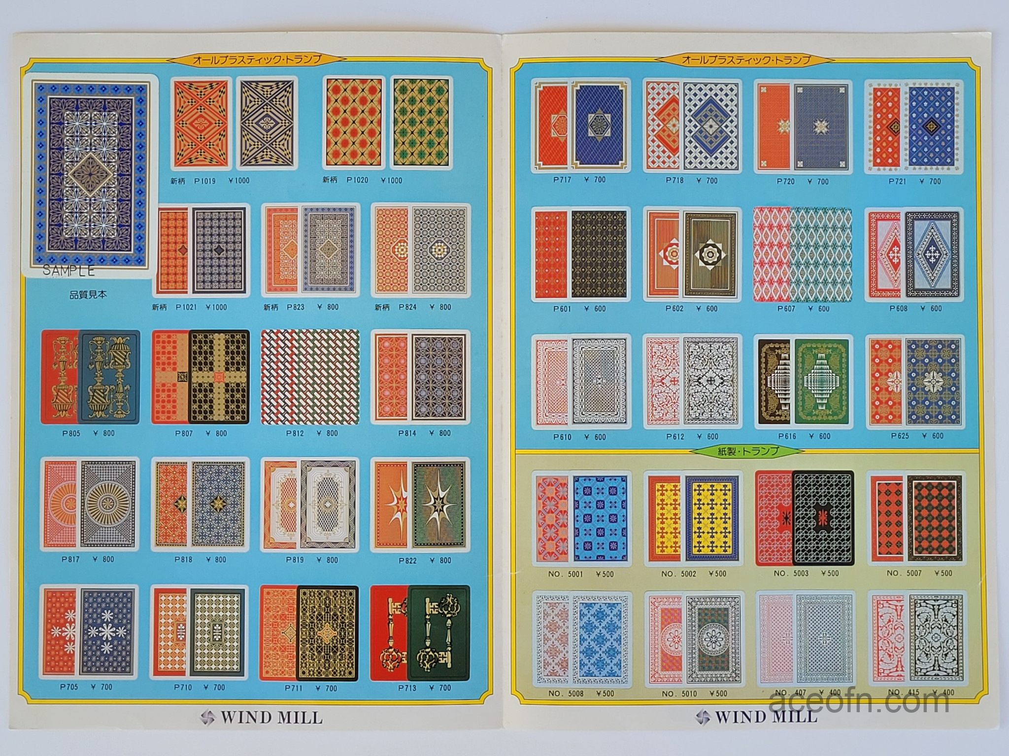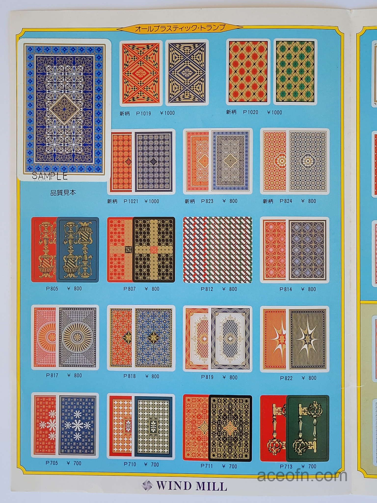 Wind Mill catalogue – 1983-1984 Posted in Merchandise No Comments Last updated on November 17, 2025 Wind Mill playing cards catalogue from 1983-1984.It consists of 4 pages, plus a flying leaflet of hanafuda and Ogura Hyakunin Isshu cards.